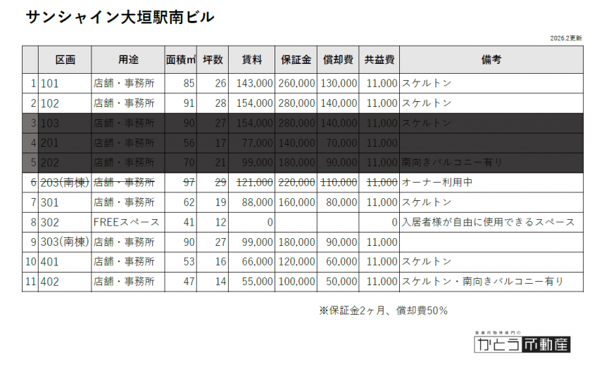 | 備考 | ・記載賃料は401区画になります ・募集区画4階(401・402) ・402区画:47㎡(約14坪)賃料5.5万円共益費1.1万円 保証金2ヶ月償却費50% ・改装は借主負担 ・水道料金は共益費に含まれています(水道をたくさん使う業種は水道代別途相談) ・電気・都市ガスは個別に契約 ・駐車場有(台数、賃料、場所要確認) ・短期解約違約金有 ・3階フリースペースは自由に使用可 ・1階3階4階テナント募集中(詳細別記事にて) ・保証会社加入要(初回保証料:賃料総額の1か月分) ・火災保険加入要 |