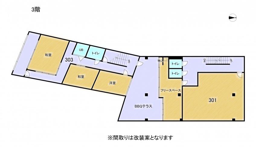 | 備考 | ・記載賃料は301区画になります ・募集区画3階(301・303) ・303区画:90㎡(約27坪)賃料9.9万円共益費1.1万円 保証金2ヶ月(洋室1+和室2)償却費50% ・改装は借主負担 ・飲食店可 ・水道料金は共益費に含まれています(水道をたくさん使う業種は水道代別途相談) ・電気・都市ガスは個別に契約 ・駐車場は1区画契約につき2台まで可(¥8,800/台) ・近隣追加P有(3-5台可:¥27,500) ・短期解約違約金有 ・3階フリースペースは自由に使用可 ・1階~4階テナント募集中(詳細別記事にて) ・保証会社加入要(初回保証料:賃料総額の1か月分) ・火災保険加入要 |