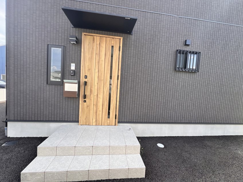 スタイリッシュな外観と木目調の玄関ドアがアクセントになっていて