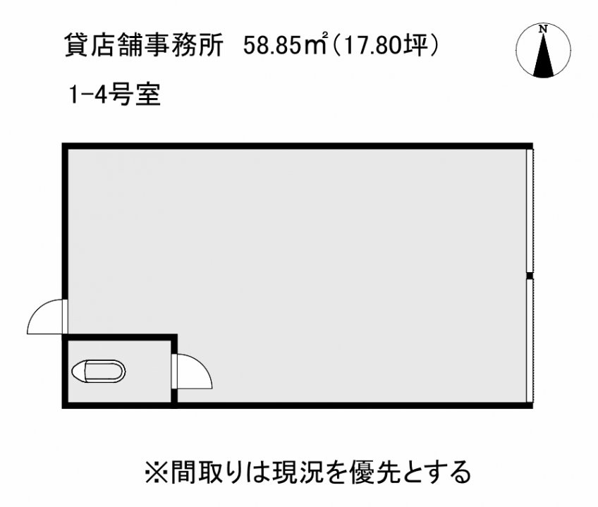 | 備考 | ・記載賃料は1-3号室です。2部屋募集中(1-3号室、1-4号室) 【1-4号室】面積:58.85㎡ 賃料:77,000円 敷金:77,000円 償却:77,000円 礼金:無 その他条件同一 ・短期解約違約金1年未満2カ月、解約時月割清算 ・敷地内駐車場満車(近隣月極有 3,500円(税込)/台) ・現状渡し ・飲食店不可 ・同建物内:マッサージ店、介護事業所入居中(2025.5現在) ・火災保険加入要 ・保証会社加入必須(初回保証料:賃料総額の1ヶ月分) |