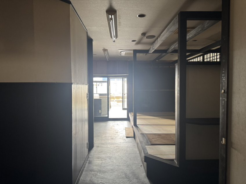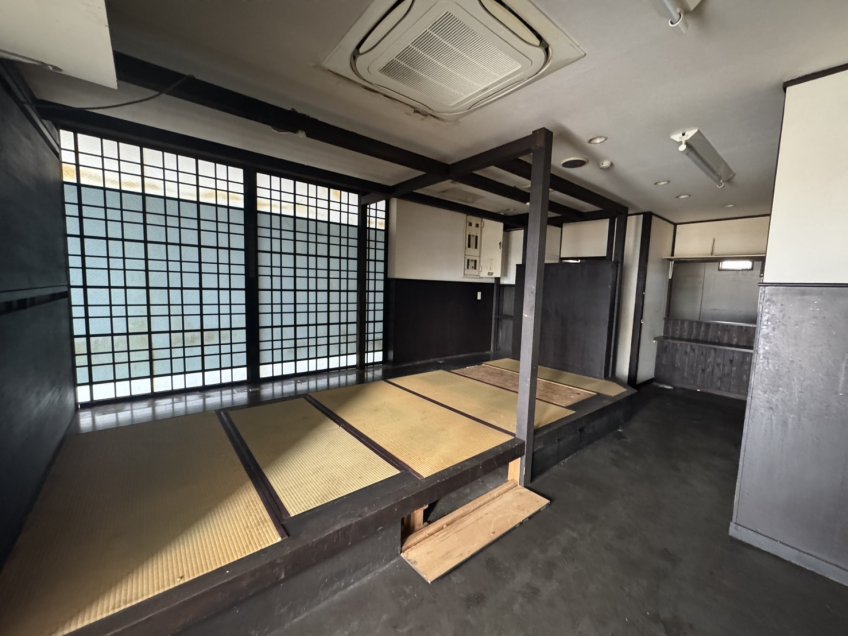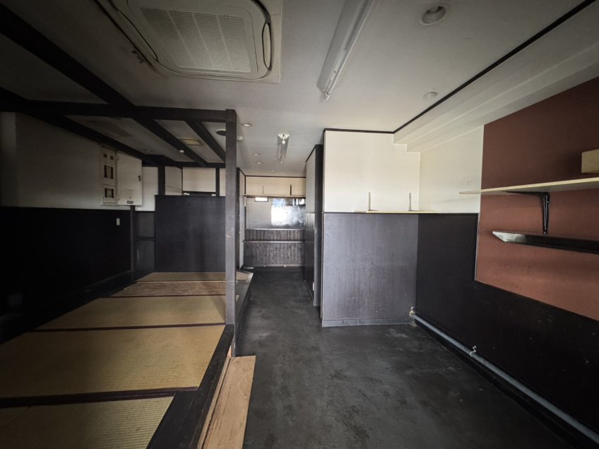 店舗は飲食店の居抜き物件で、座敷スペースや奥にはコンパクトなカウンターもあり、業態に合わせた柔軟な活用が可能です。