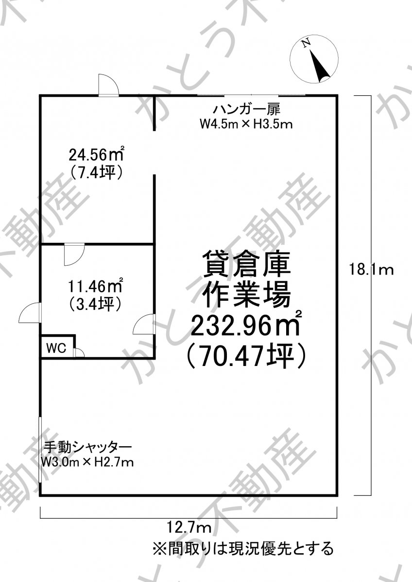 物件番号 R2597 I 物件種別 貸倉庫兼作業場 都市計画 非線引き地域 接道状況 北・東 取引形態 媒介
