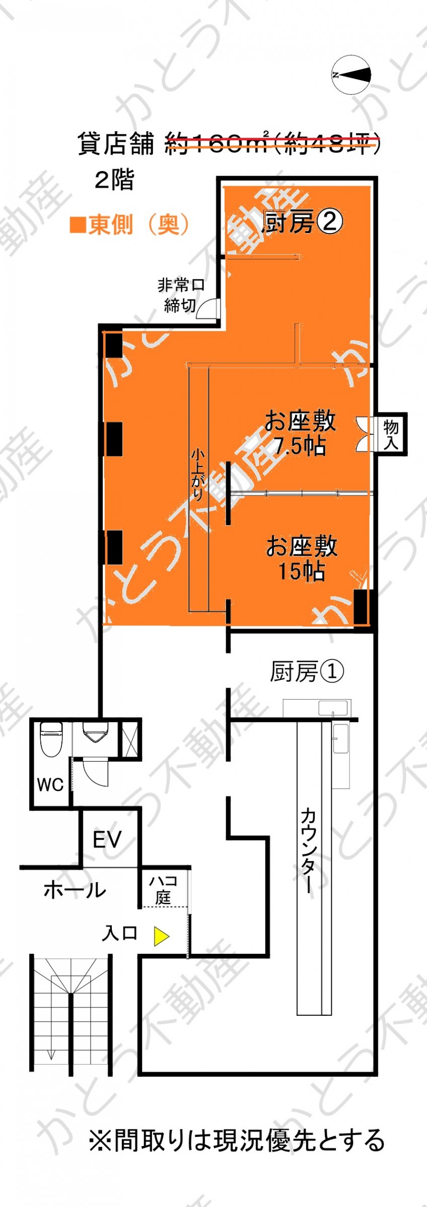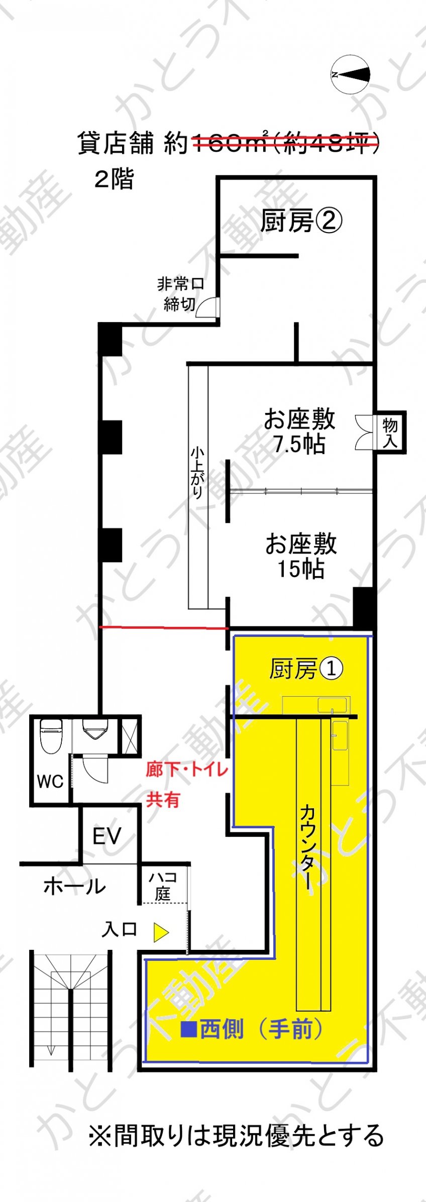 | 備考 | ・分割貸出し(西側・東側:同賃料16.5万円) ※面積は確認中です、区切り部分、相談可 ・フロア内の廊下、トイレは共用になります ・井戸水・下水は貸主割当請求 ・電気もキュービクル供給のため貸主割当請求 ・グリストラップ共有(1F焼肉店と)協議要 ・井戸水・滅菌器は建物全体で管理 ・看板使用可(袖・インフォメーション) ※ガラス面看板は東側(奥)フロア優先 ・現状渡し ・保証会社加入要(初回保証料:賃料総額の1ヶ月分) ・火災保険加入要 |